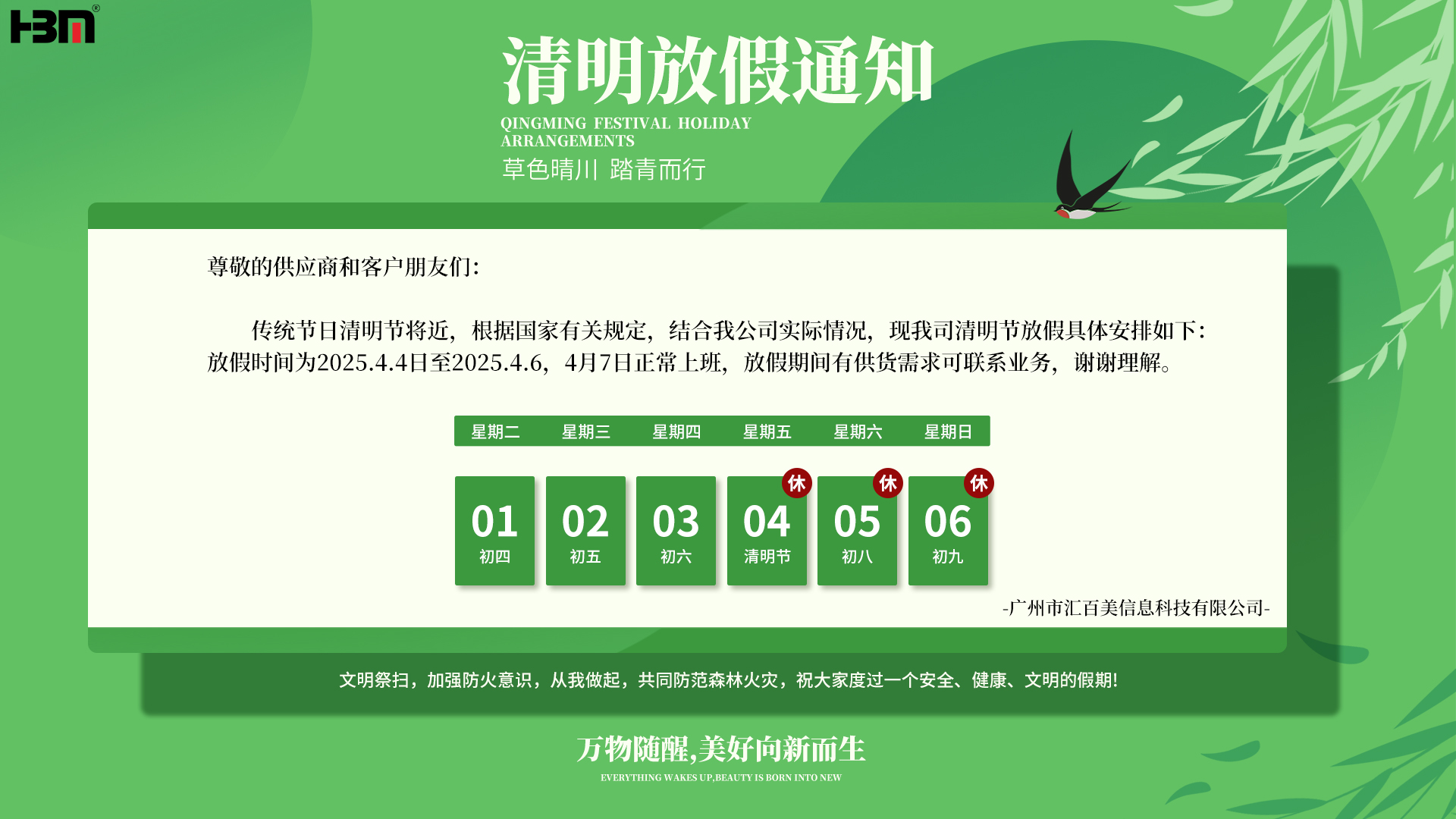 廣州匯百美信息科技2025春節(jié)放假通知:春節(jié)我司放假時(shí)間安排如下:2025.01.23(農(nóng)歷十二月二十四)至2025.2.08(正月十一),正月十二正式上班